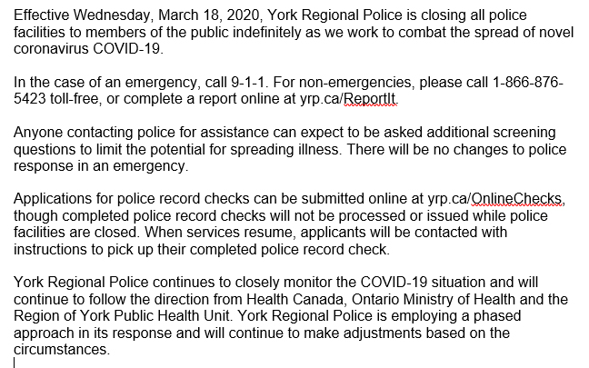 York Regional Police On Twitter Police Facilities Closed To The Public Indefinitely Effective Wednesday March 18 2020 Click The Following Link For More Information Gt Https T Co S40osm965b Https T Co Jvtijxziks Twitter